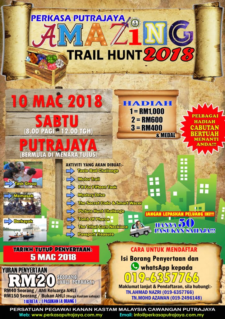 PERKASA PUTRAJAYA: AMAZING TRAIL HUNT 2018 Sila download borang penyertaan di pautan berikut:http://www.mediafire.com/file/i7eztwqnc26hbad/Amazing%20Trail%20Hunt%202018%20-%20Borang%20Penyertaan.pdfBy Perkasa Putrajaya|2018-02-13T11:44:07+08:00February 13th, 2018|0 CommentsLeave A Comment Cancel replyYou must be logged in to post a comment.