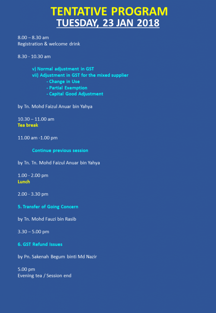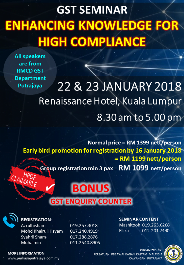 PERSATUAN PEGAWAI KANAN KASTAM, PUTRAJAYA BRANCH (PERKASA PUTRAJAYA) will be hosting the “GST: ENHANCING KNOWLEDGE FOR HIGH COMPLIANCE” seminar.