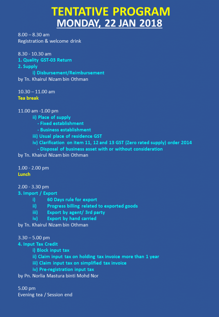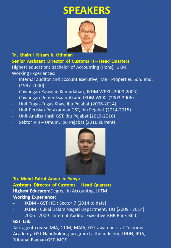 Many errors arise as a result of lack of knowledge of GST rules and regulations. It is imperative that staff responsible for a company’s GST returns must be equipped with the necessary GST knowledge. Our topic on this seminar will provide an excellent platform to view GST afresh and to keep abreast of GST legislative changes.
