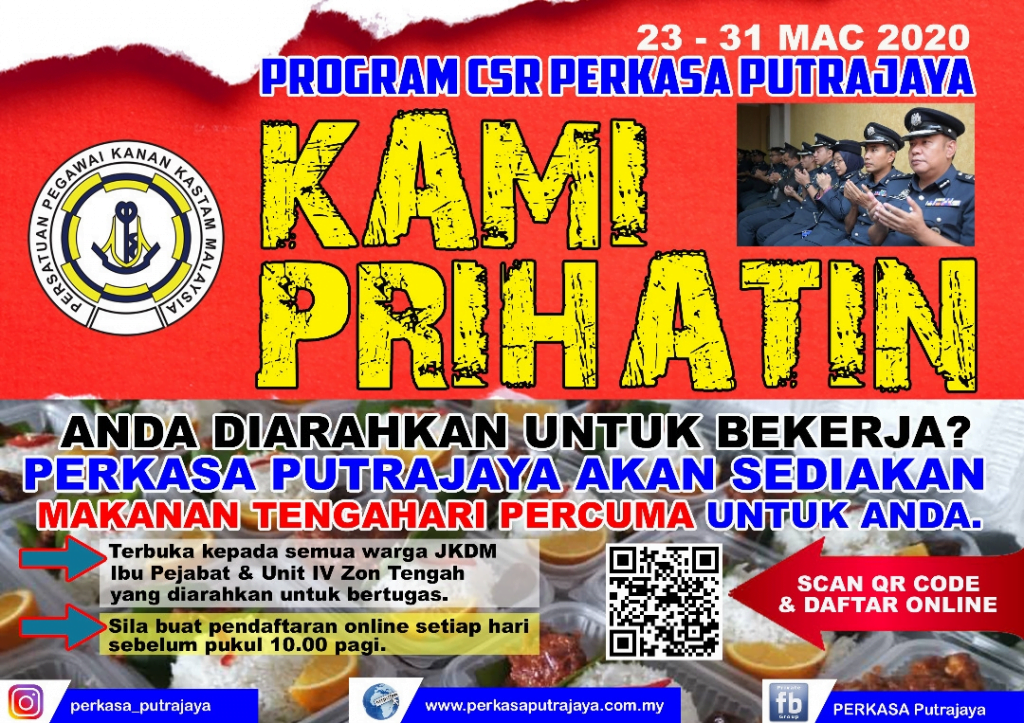 PERKASA Putrajaya amat prihatin kepada warga JKDM di Putrajaya yang diarahkan bertugas di saat kerajaan menguatkuasakan Perintah Kawalan Pergerakan bagi membendung Covid-19. Sehubungan dengan itu, PERKASA Putrajaya akan menyediakan ” Lunch Pack ” / Makanan tengahari yang dibungkus secara PERCUMA kepada warga JKDM Putrajaya yang diarahkan bertugas di Putrajaya.