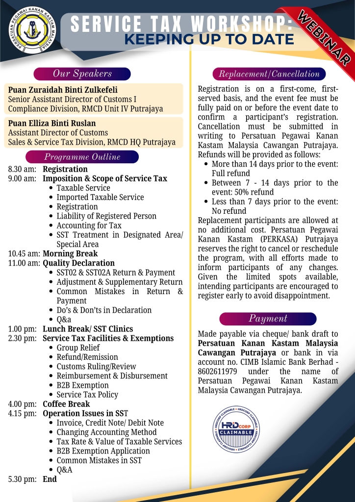 PERSATUAN PEGAWAI KANAN KASTAM MALAYSIA CAWANGAN PUTRAJAYA (PERKASA PUTRAJAYA) will be organizing WEBINAR and SEMINAR as follows: