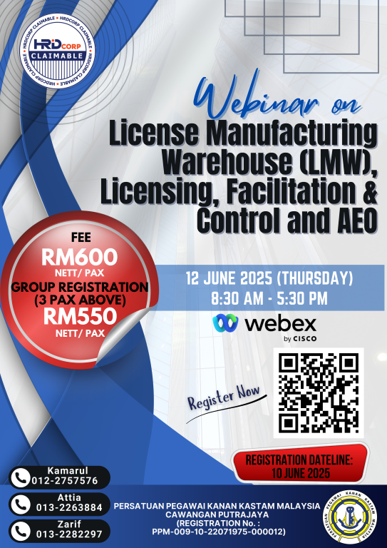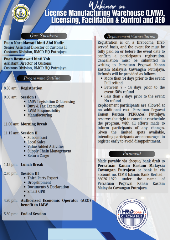 PERSATUAN PEGAWAI KANAN KASTAM MALAYSIA CAWANGAN PUTRAJAYA (PERKASA PUTRAJAYA) will be organizing WEBINAR as follows: