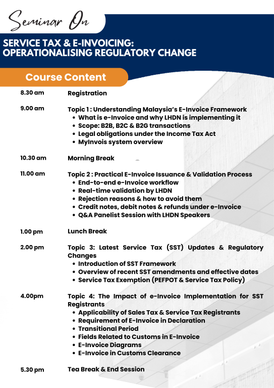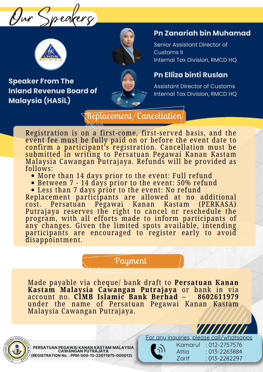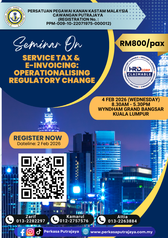 PERSATUAN PEGAWAI KANAN KASTAM MALAYSIA CAWANGAN PUTRAJAYA (PERKASA PUTRAJAYA) will be organizing SEMINAR ON SERVICE TAX & E-INVOICING: OPERATIONALISING REGULATORY CHANGE.