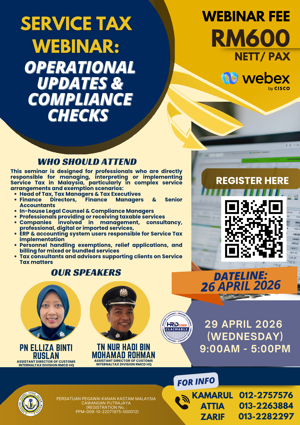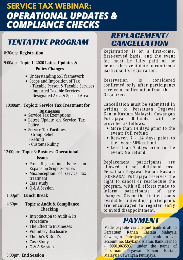 PERSATUAN PEGAWAI KANAN KASTAM MALAYSIA CAWANGAN PUTRAJAYA (PERKASA PUTRAJAYA) will be organizing SERVICE TAX WEBINAR: OPERATIONAL UPDATES & COMPLIANCE CHECKS.