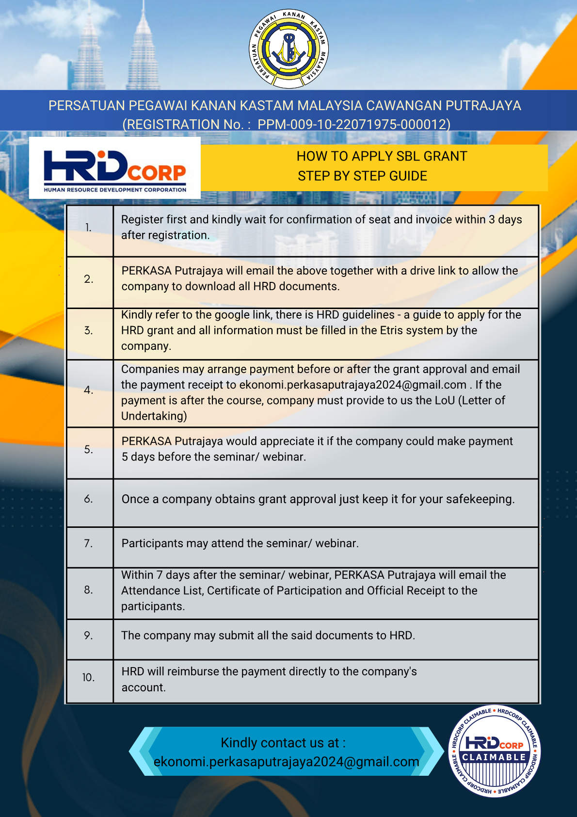 These programs are HRDF-claimable under SBL scheme (Pay and Claim) , and all necessary documentation will be provided upon registration. The HRDF claim process is as follows: