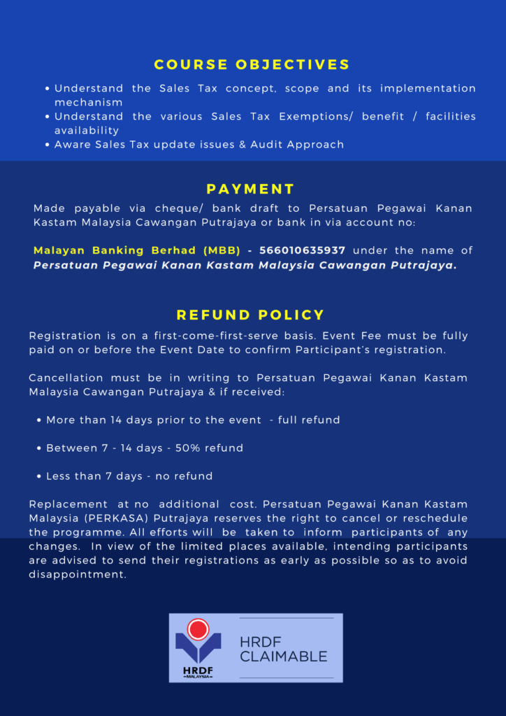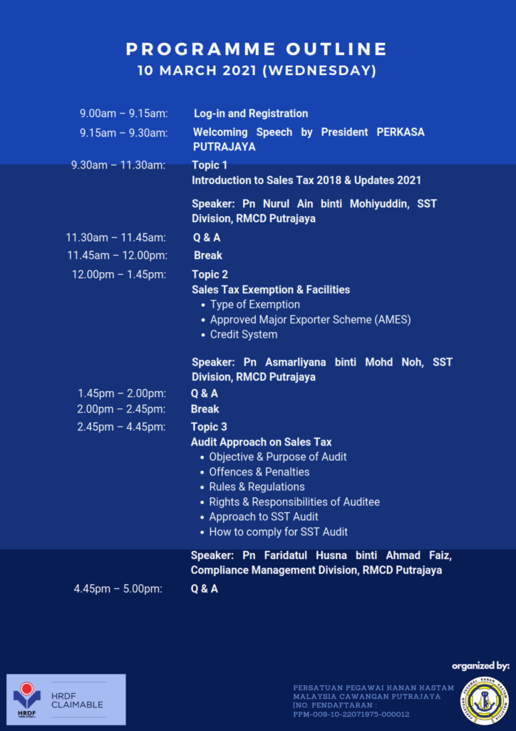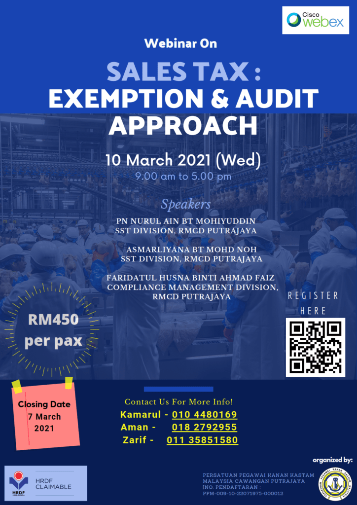 Please be informed that PERSATUAN PEGAWAI KANAN KASTAM MALAYSIA, PUTRAJAYA BRANCH (PERKASA PUTRAJAYA) will be hosting the “Webinar on Sales Tax: Exemption & Audit Approach”.
